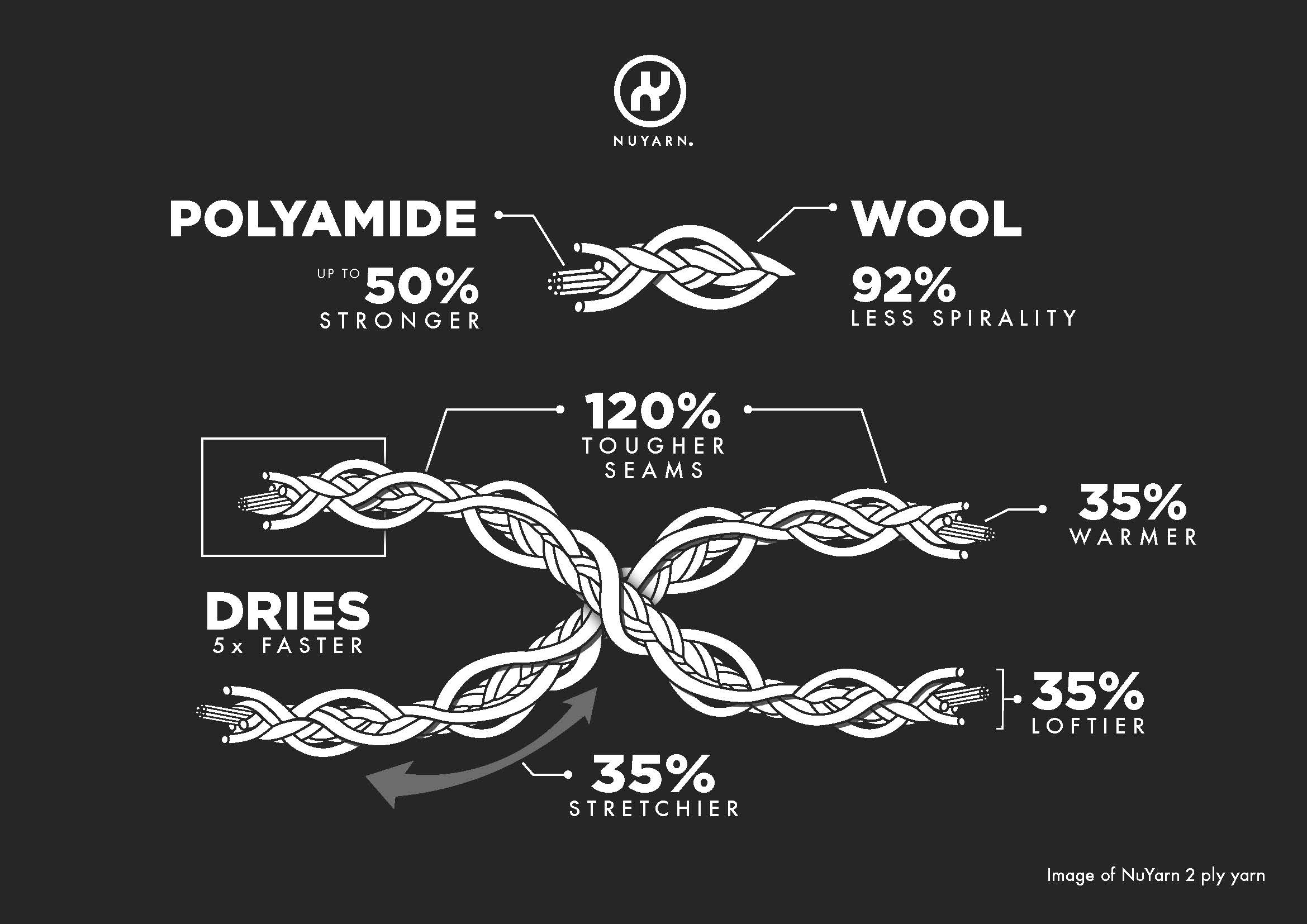 •  Nuyarn produces loftier yet lighter fabrics, with up to 35% more thermal resistance. Insulating air in the garment.