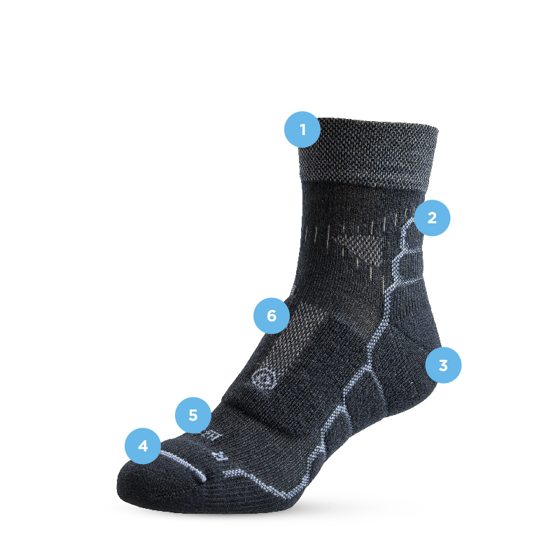 Our technical features are complimented by the Nuyarn® construction, offering all the moisture wicking, durable, blister free advantages that we love about this twist free spinning technology.